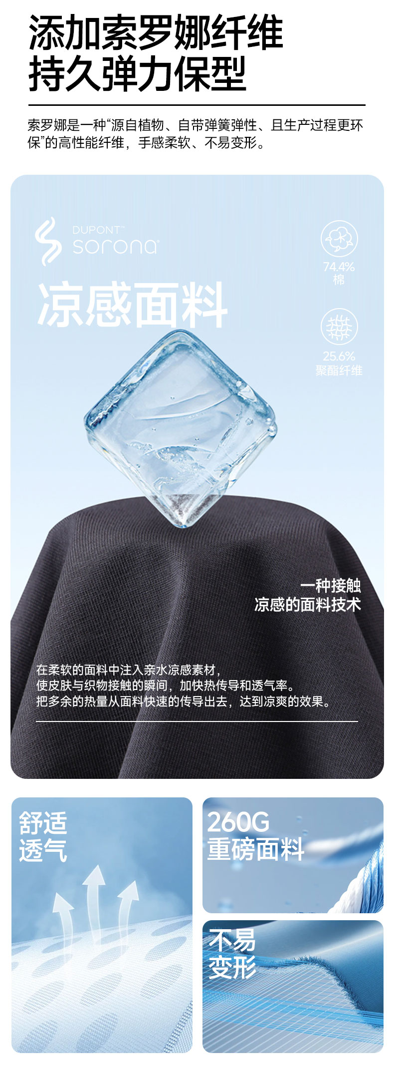 面料名称棉+索罗娜面料克重:260 g纱线支数:40支双纱